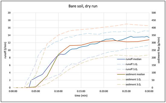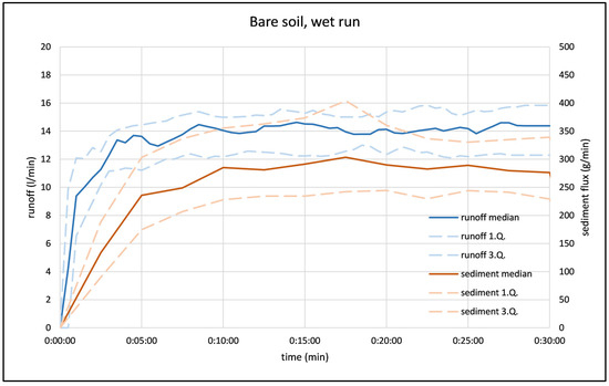 The runoff and sediment curves are presented as the medians of dry runs of 71 experiments (solid lines). The curves of the 1st and 3rd quartiles are drawn (dashed lines). Surface runoff begins in the fourth minute of simulation, and slowly climbs to a rate of 13.5 L·min−1 after 20 min. The standard deviation decreases from 4–5 L·min−1 to 2.5 L·min−1 at the end of the simulation. The amount of sediment transported increases more slowly than the runoff, and reaches a stable rate of 315 g·min−1 in the 17th minute. The slower rise is more visible in dry conditions, and can be explained by the delay between surface runoff and actual soil disturbance.