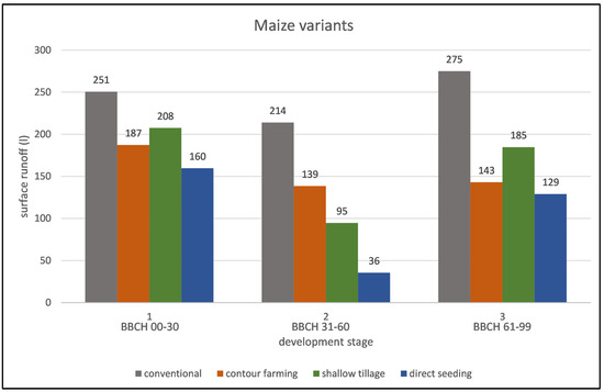 In terms of sediment transport, the effect of soil conservation technology is more apparent. For conventional maize farming, there is an average of 2.7 kg of transported sediment. Contour farming reduces the amount of transported sediment by 70% to 0.9 kg, shallow tillage reduces the amount by 85% to 0.4 kg and direct seeding reduces the amount by 96% to 0.1 kg of transported sediment. Soil conservation technology mainly protects the soil from rainfall disturbance and has a lesser effect on reducing runoff. Lower runoff can be observed in Figure 5, and lower sediment transport can be observed in Figure 7, during the second BBCH stage (BBCH 31 to 61), related to the development of the maize plant. The plant has the biggest leaf area during this stage [30].