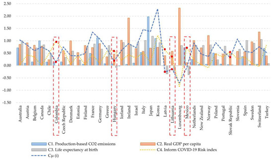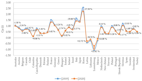 It is conceivable that some areas’ economic, social, and environmental sustainability performance has significantly declined as a result of the information gathered. Some of the first nations to observe the pandemic’s quick spread between 2019 and 2020 are France (−16.30%), Italy (−19.66%), and Korea (−27.58%). These circumstances should be explored in light of their insightful characteristics from an environmental, economic, and social point of view. However, depending on how risky they are in terms of COVID-19, as shown by their individual Inform COVID-19 Risk Index scores, there is a minor drop in their sustainability levels. Last but not least, there are examples of nations’ own economic, social, and environmental sustainability improving, as in the situations of Luxembourg (+32.62%), Mexico (+14.09%), and Latvia (+12.72%), some of the last nations to be affected by the pandemic catastrophe at the start of the global emergency.