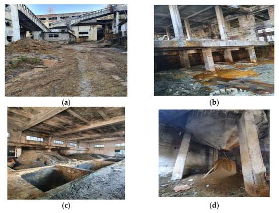 The ruins of the flotation treatment plant Băiuț with abandoned mining concentrate and sterile, Maramureș county, Romania (photos: I.A.P.): (a) Interior courtyard with sterile leaks; (b) Interior of building ruins of the treatment plant; (c) The platform of silos filling with mining concentrate; (d) Silo hopper and sterile mining.