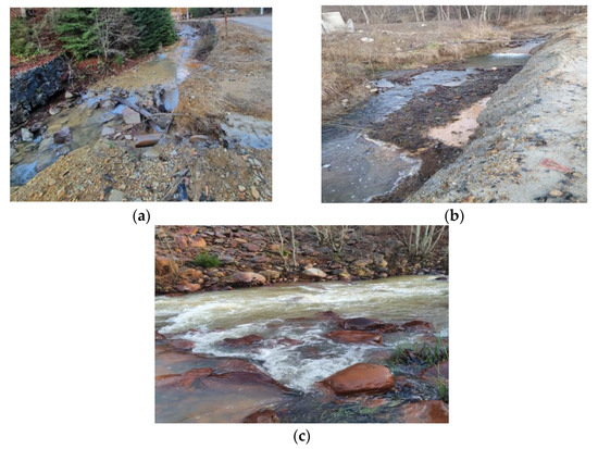 The flow of mine water in Băiuț valley, the Bloaja Tailing Valley and the collector Lăpuș River, Băiuț-Văratec metalliferous mining area, Maramureș county, Romania (photos: I.A.P.): (a) Băiuț valley; (b) Bloaja Tailing Valley; (c) Lăpuș River.