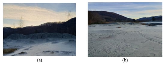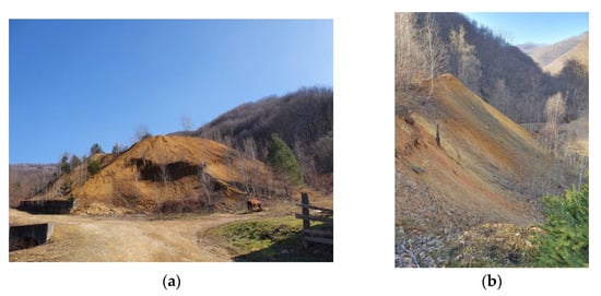 Sterile dumps, Ilba area, Romania (photos: I.A.P.): (a) Sterile dump in the vicinity of the households from which the material slid; (b) Sterile dump in the vicinity of road.
