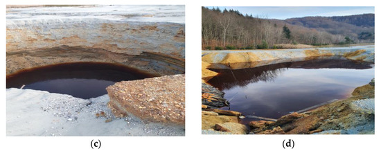 Mixed ore concentrate on the corroded platform of Bloaja sterile dump, Băiuț area, Maramures county, Romania (photos: I.A.P.): (a) Piles of ore concentrate; (b) Mining concentrate dispersed by atmospheric agents on the surface of the sterile dump; (c) Huge circular hole on the surface of the sterile dump caused by mining concentrate; (d) Huge and wide hole on the surface of the sterile dump filled with acid water.