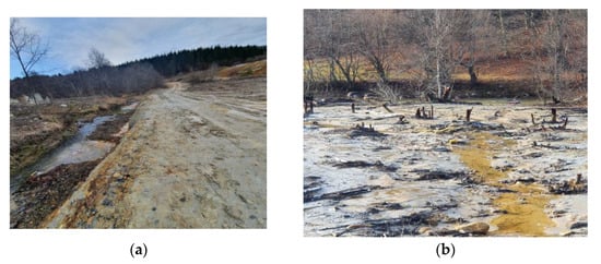 The concentration of stored pyrite (over 50,000 tons) causes acidification of the soil in neighboring areas and corrodes the inverted pump system that evacuates rainwater from the platform of the dump. As a result, four large holes have formed at the dump site [50]. As the dump is chemically and physically unstable and its storage capacity has been reached, concentrated and sterile water has flowed from the slope and leached into the surrounding soil and then into the Lăpuș River (Figure 4).