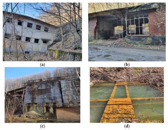 The ruins of the mining exploitation in Ilba, Romania (photos: I.A.P.): (a) Ruins of the administrative building; (b) Decommissioned building; (c) Silos with sterile material; (d) Basins with water.
