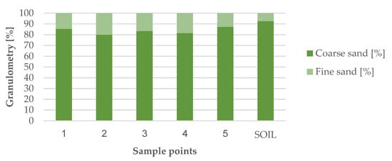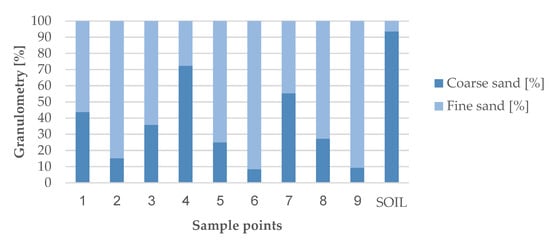 The granulometry determinations revealed that the texture of the sterile samples collected from the Băiuț sterile dump resulted from ore processing is composed of 32.52% sand mixed with 67.48% dust, and the soil sample of 93.57% sand and 6.43% dust. From the sterile samples collected from ore exploitation in the Ilba mining dump, it was found that the sterile material is made from 83.49% sand and 16.51% dust. The results in the samples collected from the Baiut and Ilba sterile mining dumps are presented as the arithmetic mean for coarse sand (>0.2 mm) and fine sand (0.2–0.02 mm) in each of the sampling points (Figure 8 and Figure 9).