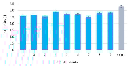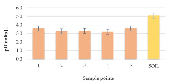 By using a multiparameter Multiline IDS–3430, the pH of the samples was determined according to STAS 7184/13-88 [58] and ISO 10390:2021 [59,60] in an aqueous solution of sterile, respectively, soil with a soil:water mass ratio of 1:10, as follows: 10 g from each collected sample was placed on the 0.1 g accuracy balance. Then, the weighted material was placed in a 100 mL glass recipients and 100 mL of distilled water was added. After homogenization, the mixture was left to rest for 2 h; then, the pH was measured.