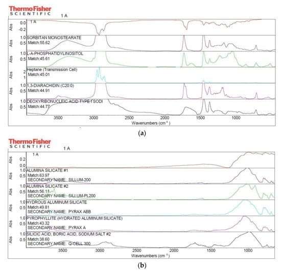 FT–IR analysis of sterile material sterile dumps of sample 1A: (a) Băiuț sterile dump; (b) Ilba sterile dump.