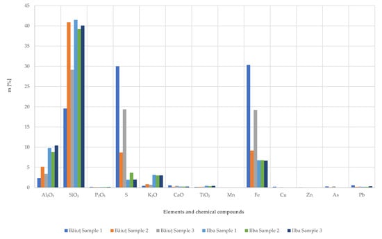 The composition of the sterile material collected from three points (1–3) from each of the sterile dumps was analyzed by XRF. The results from the XRF analysis of the samples collected from Băiut sterile dump are presented in Table 1. The XRF results for the analyzed samples collected from the Ilba sterile dump are presented in Table 2. The mean chemical composition of each sample from the sterile dumps is presented in Figure 13.