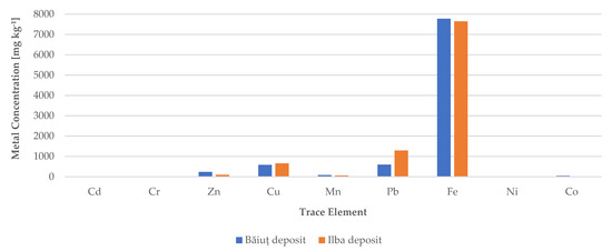 Overall, similar concentrations of Fe are found in both deposits; Pb and Cu is higher in the Ilba sterile dump, and Zn is higher in the Băiuț sterile dump (Figure 14).