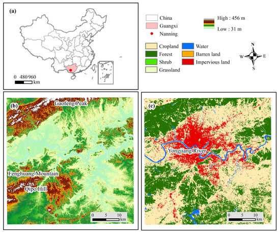 Location, elevation, and LULC of Nanning. (a) Location, (b) Elevation, (c) Land Use & Land Coverage.