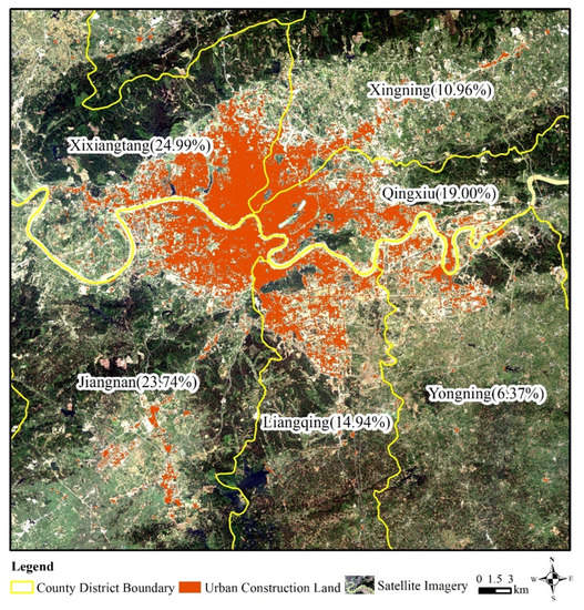 The urban construction land of Nanning was 326.33 km2 in 2021, with the largest area in Xixiangtang District (81.55 km2, 24.99%), followed by Jiangnan District (77.47 km2, 23.74%), Qingxiu District (62.01 km2, 19.00%), Liangqing District (48.74 km2, 14.94%), Xingning District (37.55 km2, 10.96%), and Yongning District (20.78 km2, 6.37%) (Figure 2).