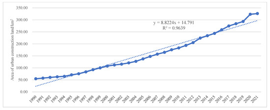 The evolution of construction land in Nanning from 1990–2021 reflects continuous growth (Figure 3). The construction area increased from 54.77 km2 in 1990 to 326.33 km2 in 2021, with a nearly five-fold increase. The construction land increased quickly during 1990–2020, with an annual increase of 8.95 km2, and became stable in 2021 with an area of 326.33 km2, which is 3.08 km2 higher than that of the previous year.