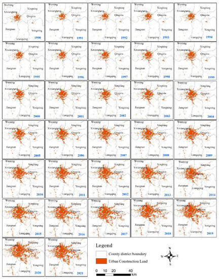 Cities are characterized by high human activity levels and intensive land use. Construction land plays an important role in cities, and its distribution and extension, to a large extent, symbolize the scope of the city and urban spatial expansion, respectively [1]. Construction land is a result of external drivers of regional gross production, structure-of-three industries, regional population, overall urban planning, etc., as well as internal elements of distances to roads or water systems, elevation, slope, soil constituents, etc. Urban expansion, occurring extensively worldwide, is mainly characterized as the rapid increase in construction land, which has a profound impact on resources, the environment, geographical processes, biodiversity, etc. [2,3,4,5,6]. The monitoring of urban construction land is an important research direction in the study global ecological environment change and sustainable development. Adopted unanimously in 2015 by all UN Member States, the 2030 Agenda for Sustainable Development (2030 Agenda) includes 17 Sustainable Development Goals (SDGs), 169 targets, and 231 unique indicators [7]. The “Indicator 11.3.1 Ratio of land consumption rate to population growth rate” is an important indicator under “Goal 11 Make cities and human settlements inclusive, safe, resilient and sustainable”, which emphasizes the importance of monitoring urban expansion and understanding the relationship between land consumption and an increasing population to sustainable urban development (https://www.un.org/sustainabledevelopment, accessed on 20 December 2022). It is closely connected with many other indicators of the SDGs, which means it ensures the integration of space, population, and land more extensively, and depicts a framework for the achievement of other goals in relation to poverty, health, education, energy, inequality, climate change, etc. (https://unstats.un.org/sdgs/metadata/, accessed on 20 December 2022). Scholars applied SDG11.3.1 to the monitoring of urban expansion land efficiency globally [8,9,10], as well as in specific countries and regions such as Portugal [11], South Africa [12], and China [13], and have demonstrated the feasibility of the indicator. Hence, improving the spatio-temporal monitoring of urban construction land and an analysis of SDG 11.3.1 provide the basis for the study of the effects of human activities on ecological environment changes. These are also important pathways to the improvement of human wellbeing and the achievement of UN SDGs.