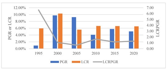 - During the 32-year study period, the LCRPGR of Nanning declined with one peak period of around 1995, which means that during this period, the sustainable development level was low. In the remaining years, the LCRPGR was relatively stable, and construction land expansion and population growth were relatively balanced, with a high sintensity of land use. This proves that Nanning’s sustainable development level has been improved due to the adjustments to the plans.