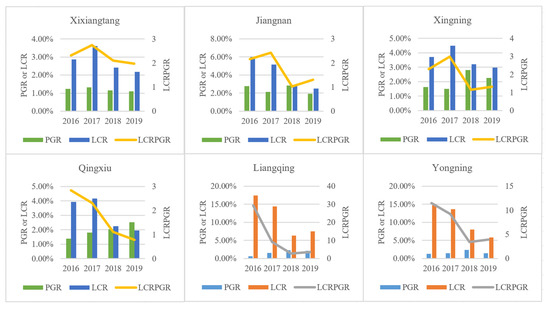As indicated by Figure 8, the LCRPGR of mature districts is characterized as an N shape, experiencing a phase of “increase–decrease–increase”. The PGR of mature districts tended to be more stable with an average of lower than 2%. The above information shows that the population of mature districts became more saturated, and its growth also slowed down. However, construction land has continuously increased. In 2019, the increase in LCR led to an increase in the LCRPGR of Xixiangtang and Xingning with a slight risk to sustainable development.