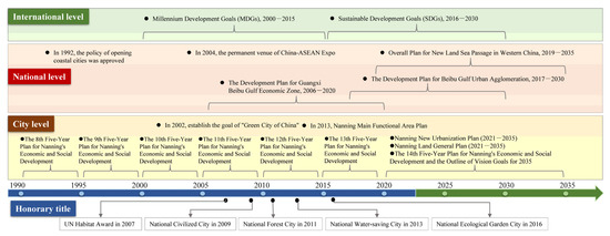 According to Figure 3, Figure 5 and Figure 9, it can be seen that international-, national-, and city-level strategies jointly influence urban construction land expansion in Nanning City. The main strategies at the international level include UN MDGs and UN SDGs (Figure 9), which are global macro frameworks that do not have a significant and direct impact on the change of construction land in Nanning City, but they guide the direction of national and city level planning, e.g., the focus of both national and city level planning shifted from production to production–living–ecology since 2000.