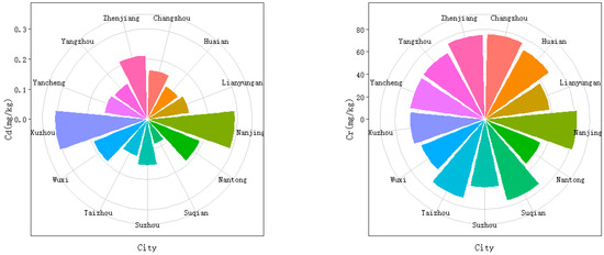 Jiangsu Province is located in the Yangtze River Delta economic belt and is densely populated [26]. Jiangsu is industrially developed, with a large number of metal smelting, chemical, pharmaceutical, microelectronics, and other factories [27,28]. Obviously, the ecological environment has been seriously disturbed by human activities [4]. Jiangsu Province has a long history of planting wheat, rice, maize, and other crops. The agricultural soil heavy metal pollution has attracted the attention of an increasing number of researchers [25,29]. However, most studies of the pollution in agricultural soils in Jiangsu have focused on the pollution status of single cities or areas close to pollution sources, such as Nanjing, Wuxi, and Kunshan [30,31,32]. In addition, there have been few studies on the long-term monitoring of soil heavy metals across Jiangsu Province.
