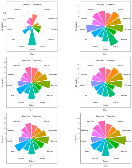In order to quantify the variations between regions and cities, subgroup analyses based on geographical location and city level were conducted (Table 2). More studies were carried out in southern Jiangsu (including Nanjing, Suzhou, Changzhou, Wuxi, and Zhenjiang), followed by the central region (Yangzhou, Nantong, and Taizhou), and the northern region (including Xuzhou, Yancheng, Suqian, Lianyungang, and Huaian). The eight high-concentration elements were prevalent in southern cities, while northern cities showed high concentrations of three elements (Cd, As, and Ni). The central region only showed a slight accumulation of heavy metals. In summary, the accumulation of heavy metals was most severe in southern Jiangsu Province. The result agreed with previous reports, that socio-economic activities were more prevalent in southern Jiangsu, and the enrichment of heavy metals was more significant [29].