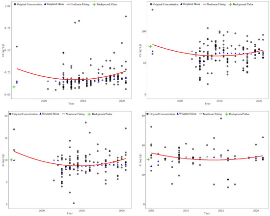The temporal variation of heavy metal accumulation. The green points represent the agricultural soil background values in Jiangsu.