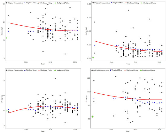 In order to observe the cumulative change over time from 1993 to 2021, an annual subgroup analysis was performed. The results showed that there were fluctuations in the accumulation of soil heavy metals over time, but the differences were not significant. Soil is the sink for various pollutants in the environment, and contaminants continue to accumulate when contaminant input consistently exceeds output [40]. Therefore, cumulative meta-analysis and linear regression explore the temporal trend in heavy metal accumulation (Figure 4). During the study period, the accumulation of Cu, Zn, and Hg continued to decrease, with Hg decreasing most significantly. The accumulation of Cd, Pb, Cr, Ni, and As fluctuated. From 1993 to 2021, the inputs of Cd, Hg, Pb, Zn, and Cu were greater than the outputs, whereas As, Cr, and Ni remained in balance with background values. The accumulation of Pb increased until 2010 and then decreased, while Cd did the opposite. Apparently, the cumulative change point is close to the year 2010.