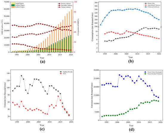 Temporal trends in economic and emission data: (a) Annual GDP and composition of different regions in Jiangsu Province; (b) annual consumption of agricultural materials; (c) annual emissions of sulfur dioxide and soot; (d) annual emissions of wastewater and residue.
