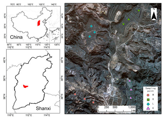 The study area is located in the open-pit mining area of Ke’e Village, Yangquanqu Town, Xiaoyi City, Shanxi Province in the hilly and gully area of the Loess Plateau, with geographic coordinates of 111°30″–111°31″ E and 37°08″–37°09″ N (Figure 1). It belongs to the warm temperate continental semi-arid and semi-humid climate. The average altitude is 1196.89 m, the annual average temperature is 10 °C–12 °C, the annual average sunshine is 2640.7 h, the average total solar radiation is 147 kcal/cm2, the sunshine rate is 60%, the average precipitation is 486 mm, and the annual average frost-free period is 190 days. The soil type is yellow cotton soil, light loam, and medium loam, with a loose structure and good air permeability. The vegetation type mainly comprises sweet wormwood herb (Artemisia annua L.), alfalfa (Medicago sativa Linn), lespedeza (Lespedeza bicolor Turcz), and yellow rose (Rosa xanthina Lindl).