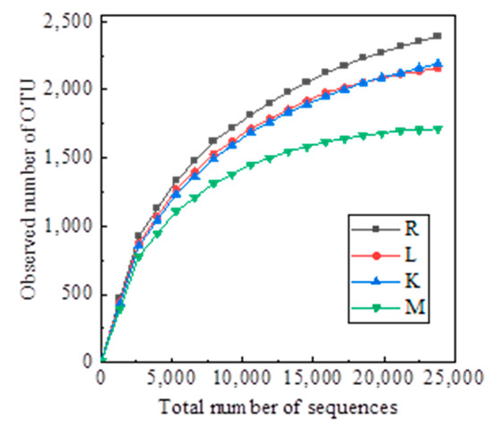 The bacterial V4–V5 regions were sequenced and 1,178,111 valid sequences were obtained. The effective sequences obtained were randomly sampled, the OTU was clustered at the 97% similarity level, and the OTU dilution curve was drawn, as shown in Figure 2, to analyze the microbial community abundance. A total of 239,092 OUT samples were obtained, of which the yellow rose sample was the largest, accounting for 27.22%; the lespedeza and sweet wormwood herb samples accounted for 25.21% and 24.97%, respectively; and the alfalfa sample was the smallest, accounting for 22.53%. The number of bacteria in the soil showed the rule of yellow rose > lespedeza, sweet wormwood herb > alfalfa. With an increase in sequencing quantity, the slope of the rarefaction curve of all sample points gradually rises and finally tends to be flat. It shows that the sampling is reasonable and can truly reflect the diversity of the soil bacterial community.
