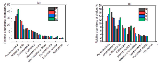 In terms of bacterial community diversity, the soil bacterial community diversity indexes of different plant types also show consistent rule, which is consistent with the research results of Wang Mei and Chen Mengli [35,36]. Many existing studies have shown that the diversity of plants is closely related to the diversity of soil microorganisms [37]. The bacterial community diversity of sample alfalfa is the lowest, mainly because the soil ecosystem has been exporting biomass to the outside for a long time without sufficient supplementation and the biodiversity of the entire ecosystem is not high, resulting in a reduction in the total amount and diversity of soil bacterial community.