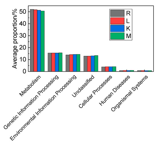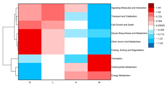 Comparison of differences in abundance between KEGG secondary functions with different vegetation types. Notes: M is alfalfa; R is yellow rose; L is lespedeza; K is sweet wormwood herb.