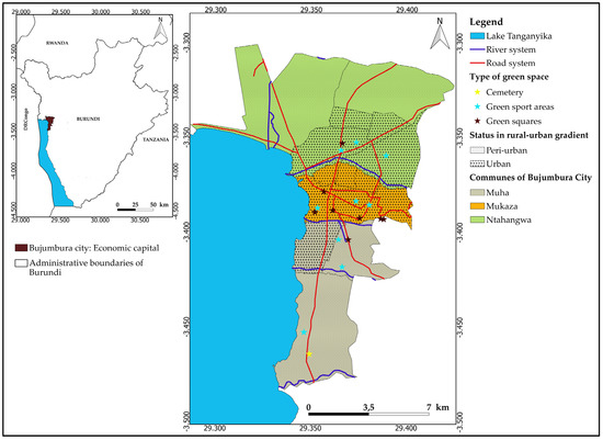 - Kabanyegeye, H.; Masharabu, T.; Sikuzani, Y.U.; Bogaert, J. Perception sur les espaces verts et leurs services écosystémiques par les acteurs locaux de la ville de Bujumbura (République du Burundi). Tropicultura 2020, 38, 1–17. [Google Scholar] [CrossRef]