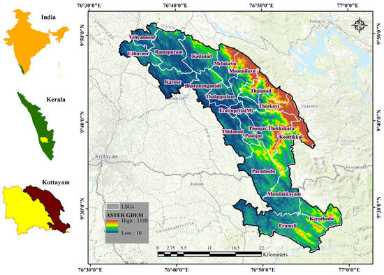 The area selected for this study lies between 9°20′ and 9°55′north latitudes, and 76°30′ and 77°0′east longitudes. This area comprises 20 LSGs (19 panchayat (panchayat is the LSG in a hamlet) and one municipality (municipality is the LSG in a town)), namely, Bharananganam, Erumely, Kadanad, Karoor, Koottickal, Koruthodu, Melukavu, Moonnilavu, Mundakkayam, Parathodu, Poonjar, Poonjar-Thekkekara, Ramapuram, Teekoy, Thalanad, Thalappalam, Thidanad, Uzhavoor, Veliyannoor, and Erattupetta municipality. The study area spans around 737.77 km2 (Figure 2). A total of 73 landslides occurred in this region during the 2018 monsoon season [6].