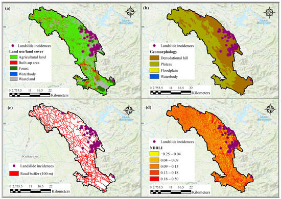 The slope was computed from the ASTER GDEM using ArcGIS surface (spatial analyst) tools. The road cuttings were derived from the topographic maps and Google Earth Pro, and a 100 m buffer was computed utilizing the ArcGIS proximity tool. Soil and lithology were extracted from the National Bureau of Soil Survey and Land Use Planning (NBSS & LUP) soil map and Geological Survey of India (GSI) geological maps, respectively, using ArcGIS tools. The ERDAS Imagine software was employed to extract the LULC types from the Landsat 8 images (acquired on 16 January 2022, Path: 144, Row: 053, Landsat scene identifier: LC81440532022016LGN00). In the ERDAS Imagine software, various LULC types found in this area were classified using the maximum likelihood supervised classification approach [78,79]. The geomorphic classes were extracted by visual interpretation of Landsat 8 images aided by field knowledge. The topographical map and high-resolution Google Earth imagery were used to verify this. The NDRLI, NBR, NDWI, and SAVI were derived from the Landsat images utilizing the ArcGIS map algebra tool. Equations (1) [80], (2) [81,82], (3) [83], and (4) [84] were used to compute the NDRLI, NBR, NDWI, and SAVI, respectively: