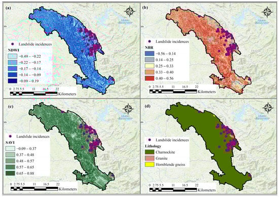 - The continuous factor layers (slope, normalized difference road landslide index (NDRLI), normalized difference water index (NDWI), normalized burnt ratio (NBR), and soil-adjusted vegetation index (SAVI)) were categorized into five classes using the natural breaks method [72,73,74,75].