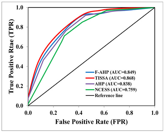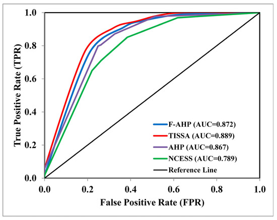 A two-dimensional metric of classification performance is the ROC technique [103]. The model has outstanding performance when the AUC value is within the range of 0.9–1.0; excellent performance when the value is within the range of 0.8–0.9; and acceptable performance when the value is within the range of 0.7–0.8 [75]. The AUC values ranged between 0.6 and 0.7, and values of 0.5 and 0.6 depicted poor performance and failure, respectively [104]. Utilizing the training and validation datasets, the AUC value can reflect the model’s success and prediction rate [105]. In this study, the incidence data were randomly divided into training and validation datasets of 60% and 40% [106], respectively, and the AUC values were calculated with SPSS software. The 60–40% split is acceptable when the dataset is small [106].