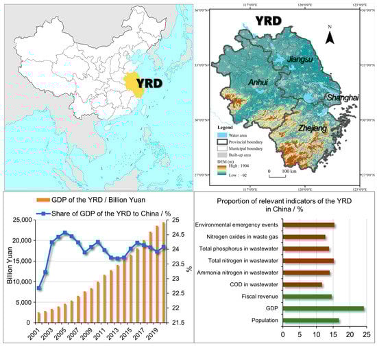 With regard to the natural sphere or eco-environmental status, the YRD is composed of an estuary delta plain and surrounding hilly areas, resulting in relatively lower regional average elevation and slope. Located in the lower reaches of the Yangtze River, Huaihe River, Qiantang River, and ancient Yellow River, the YRD features variegated river–lake systems and abundant water resources. Moreover, the main climate type in the YRD is subtropical monsoon, characterized by warmth and humidity. The aforementioned conditions related to climate, topography, and natural resource endowment are conducive to highly intensive urban development and industrial agglomeration in the YRD. However, the intensive exploitation and extensive utilization of natural resources (e.g., land, non-renewable energy, and mineral resources) have brought great pressure to the limited capacity of the regional ecological environment in the YRD [41,42,43]. The YRD, accounting for 15.1% of total nitrogen emissions, 13.8% of total phosphorus emissions, 12.7% of nitrogen oxides emissions, and 15.4% of environmental emergency events in China in 2020, has been viewed as one of the regions with the most serious industrial pollution across the country. This led to an investment of RMB 13.7 billion in the treatment of industrial pollution in the YRD, accounting for 30.2% of China. The contradiction between socioeconomic development and eco-environmental protection has been becoming increasingly acute in the YRD, especially in ecologically sensitive subregions.