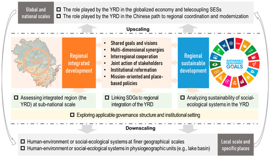Therefore, the basis of our discussions is the importance of research on nature–society (or social–ecological) interactions and sustainable development practices at the subnational scale (e.g., highly urbanized regions located in the Global South and developing countries) for sustainability science and achieving SDGs. Following similar research veins, variegated issues related to economic, social, and eco-environmental sustainability in China’s major urban agglomerations, such as the Beijing–Tianjin–Hebei region (JJJ), the Yangtze River Delta (YRD), the Pearl River Delta (PRD), and the Chengdu–Chongqing economic circle (CY) region, have received much scholarly attention in multiple (inter)disciplines [29,30,31,32,33,34]. These urban agglomerations are key regions for regional integration and sustainable development in China. However, existing studies on the integrated or collaborative path to regional sustainable development, as well as the achievement of SDGs and the sustainability of social–ecological systems (SESs) at the regional scale, are quite limited. Focusing on the YRD, which is one of the national urban agglomerations in China and one of the emerging global city-regions in the Global South, this paper considers two interrelated objectives. On the one hand, this paper tries to develop a conceptual framework for building linkages between regional integrated collaboration and the promotion of regional sustainable development, with particular attention given to the nexus between SDGs and regional integrated development tasks. On the other hand, this paper tries to propose future research agendas related to regional integration and sustainable development of the YRD, especially issues related to the achievement of SDGs, regional SESs, and integrated regions at the subnational scale.