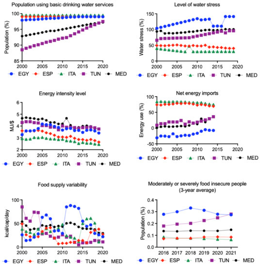 Figure 1 shows the behaviour of a selection of WEF security indicators of the four countries considered in this study, together with the average of MED area for the period between 2000 and 2020. (Due to data unavailability, the average of the MED region does not include Gibraltar, the principality of Monaco, Montenegro, and Palestine. Only in the case of food insecurity, Cyprus, Malta, Syria, and Turkey are also excluded.) The top charts regard water availability, depicting, respectively, the share of population using at least basic drinking water resources (left) and the level of water stress represented as the ratio between freshwater withdrawal and freshwater resources (right). The upper-left graph shows that Tunisia had serious deficiencies in water access at the beginning of the period under consideration, which have been largely resolved since this time. In fact, access to water has shown a rapid and steady improvement. A similar, though less pronounced, dynamic can also be observed relative to the MED area average. On the other hand, the upper-right graph shows how water availability in the driest countries, namely Egypt and Tunisia, is achieved by overexploiting or exploiting natural availability to the limit. The MED area average also shows a critical value of the water stress level. Spain and Italy, on the other hand, despite climate change, show a water stress level that is below 50%, and in general, it declined during the period under consideration. The middle plots then focus on energy-related issues and represent the primary energy intensity level (left) and the net energy import as a share of total energy use (right), respectively. It is worth noting that with the sole exception of Egypt until 2005, the energy intensity level of primary energy decreased in all of the cases considered, although Italy and Spain have lower levels. These countries, however, show a clear inclination of energy imports, which account for about 75 percent of their consumption. In contrast, Tunisia and the MED area average much lower levels, while, on the other hand, Egypt remains a net exporter of energy. Finally, the bottom charts focus on food security and show, respectively, the per capita food supply variability (left) and the number of moderately or severely food-insecure people (right). What is mainly noticeable is that there a very large variability in the food supply per capita, particularly in Egypt, showing a peak of about 90 kcal, and in Tunisia. In contrast, the MED area average, thanks to the contributions of Italy and Spain, shows steady behaviour, which for the period considered this index, ranges between 40 and 50 kcal per person per day.