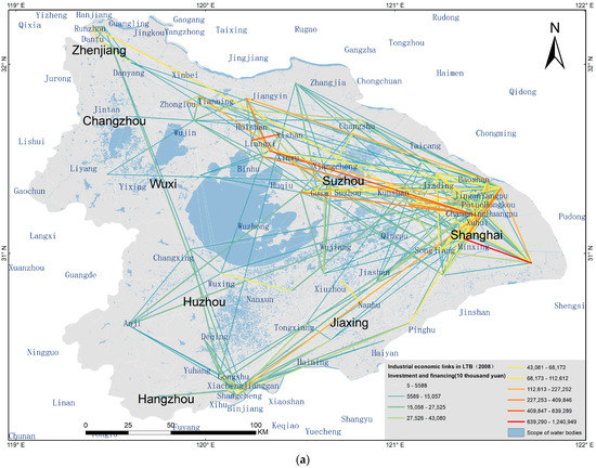 The existing studies on regional economic connections usually use gravity models to measure the regional interaction effect, taking into account factors such as the number of non-agricultural populations, GDP, and the spatial distance between the target objects [33,34]. However, such indicators can only reflect the probability of generating economic connections between the two regions and cannot be used as a basis to reflect the actual economic relationship. This study establishes an industrial economic network based on the actual investment and financing information from the Tianyancha platform. For this purpose, the total amount of interregional industrial investment and financing is first calculated based on the Equation (10).
