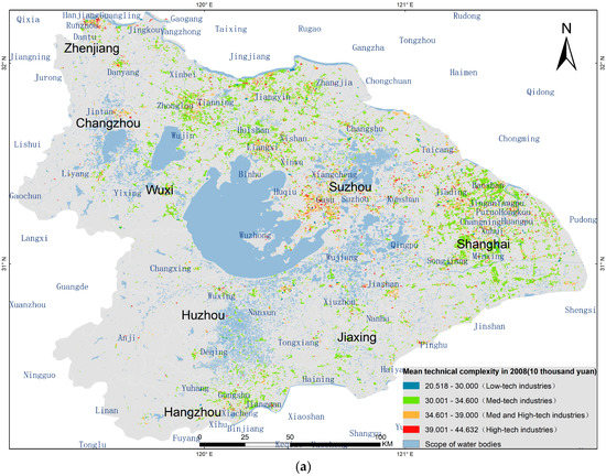 (a) Mean technology complexity of 2008; (b) Mean technology complexity of 2018.