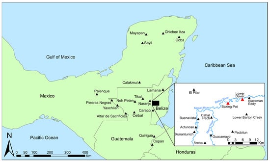 - Chase, A.F.; Garber, J.F. The Archaeology of the Belize Valley in Historical Perspective. In The Ancient Maya of the Belize Valley: Half a Century of Archaeological Research; Garber, J.F., Ed.; University Press of Florida: Gainesville, FL, USA, 2004; pp. 1–14. [Google Scholar]