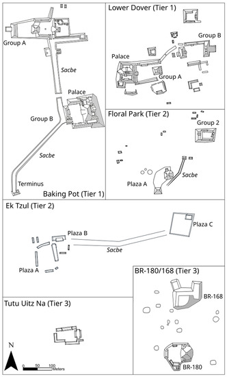 - Driver, W.D.; Garber, J.F. The Emergence of Minor Centers in the Zones Between Seats of Power. In The Ancient Maya of the Belize Valley: Half a Century of Archaeological Research; Garber, J.F., Ed.; University Press of Florida: Gainesville, FL, USA, 2004; pp. 287–304. [Google Scholar]