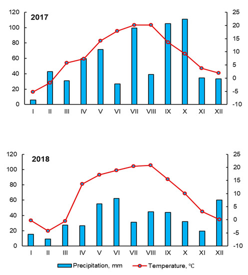 The experiment was located in eastern Poland, in the area of the Experimental Station Bezek-51°12′ N; 23°17′ E (Figure 1). The field experiment was conducted under the climate conditions of east Poland. The study area is situated in the temperate cool climate (Dfb), transitional, with substantial influence of continental climate (https://pl.climate-data.org/info/sources; accessed on 30 November 2022). The average duration of the vegetation period in the analyzed area is 210–215 days, and the period most often starts in the second or third ten-day period of March and lasts until the end of October. During the periods of the study, the meteorological conditions varied considerably. In the third year of the experiment, when soil cultivation treatments were performed to prepare the soil for winter rye sowing (2nd ten-day period of September 2017), the annual precipitation total was 598.2 mm and the mean annual air temperature was 8.9 °C. The fourth year of the study, when winter rye matured and was harvested, was a notably warmer season compared to the preceding year (9.6 °C), and it was characterized by a considerably lower annual precipitation total—433.6 mm (Figure 2).
