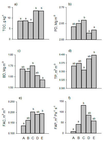 Mean values (0–20 cm layer) of soil properties: (a) total organic carbon content (TOC), (b) particle density (PD), (c) bulk density (BD), (d) total porosity (TP), (e) air capacity at the potential of −15.5 kPa (FAC), and (f) air permeability at the potential of −15.5 kPa (FAP). Explanations: treatment A—control soil without additives; treatment B—soil with N, P, K, Mg, Ca, and S fertilization; treatment C—soil with carboniferous rock; treatment D—soil with post-fermentation sediment; treatment E—soil with carboniferous rock and post-fermentation sediment. Different letters (a, b, ab, …c) mean significant differences (between treatments) according to the Tukey’s lowest significant difference (LSD).