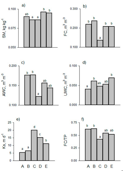 Mean values (0–20 cm layer) of soil properties: (a) water content at sampling (SM), (b) field water capacity at the potential of −15.5 kPa (FC), (c) available water content (AWC), (d) unavailable water content (UWC), (e) saturated hydraulic conductivity (Ks), and (f) FC/TP ratio. Explanations as for Figure 3. Different letters (a, b, ab, c, d) mean significant differences (between treatments) according to the Tukey’s lowest significant difference (LSD).