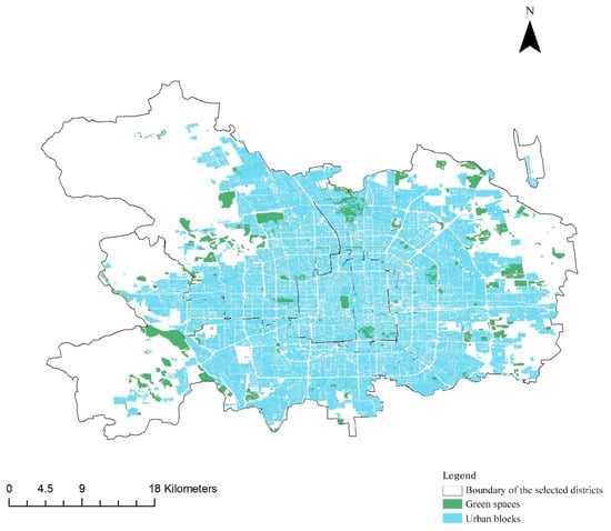 Displays the distribution of boundary of selected districts, green spaces, and urban blocks in Beijing.
