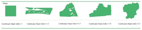 where refers to the perimeter of the patches. refers to the total landscape area (m2). If the landscape shape refers to a square, then the LSI equals 1. The larger the LSI, the greater the complexity of the landscape shape. While LSI values are not associated with definitive shapes, higher values suggest more attractive intricate landscapes. Figure 2 displays the shape series with increasing LSI values. All shapes are derived from the green spaces’ polygon database.
