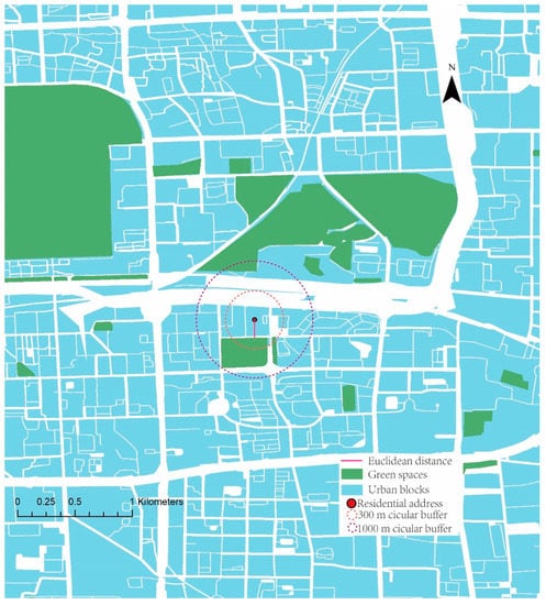 To examine whether the marginal effects of LSI on housing prices would decay as the distance from residences to green spaces increased, we defined two key buffer variables. Accessibility to green space from residences was considered in terms of intervals, within 300 m and from 300 m up to 1000 m, as studies have found that these are walkable thresholds for residents’ access to natural greenness [41]. We calculated the distance buffers based on residents’ home addresses. Two main buffers were therefore generated for access to the nearest green spaces. The definition of the intervals is illustrated in Figure 3.