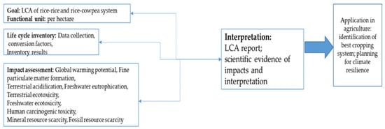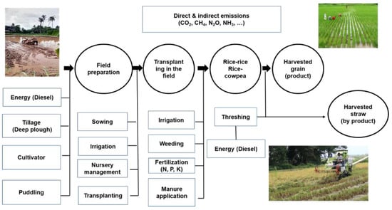 A life cycle impact assessment (LCA) was conducted using the survey data collected from the selected farms (Figure 1, see Table 1 and Supplementary Tables S1 and S2 for details). The data from farmers were collected through face-to-face interviews and group discussions. The crop mix in the farms comprised: (i) in the rice–rice system, rice production during the monsoon season and winter, with straw as a by-product; and (ii) in the rice–cowpea system, rice production during the monsoon season and cowpea production in the winter, along with their respective residues. The evaluation was made per 1 ha of land for each farm. A cultivated hectare of land (1 ha) was used as the functional unit measurement of the “land management function”, producing rice and cowpeas, along with the equivalent straw production from the respective farms. To do this, a “basket of products”, such as “rice + cowpea, as relevant + straw”, produced in one hectare (ha) of land was selected based on Nemecek et al. [33], who argued the significance of considering the whole farm context in the environmental evaluation of farm systems. Since the farms produced grain and straw from the cowpeas and rice, it was necessary to calculate the equivalent yields with straw production. We further evaluated the environmental impacts on a yield-basis. Thus, the environmental impact was allocated, which was based on the potential revenue generated from the produced products. The equivalent revenue was calculated using the price of rice, cowpeas, and straw, and was used to estimate with respect to the “reference unit”, which was used in the formulation of the life cycle inventory (LCI) and eventually for the systemic LCIA.