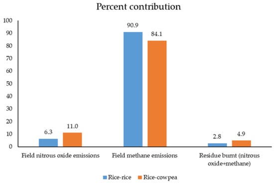 Field emissions were shown to have a predominant role, especially in terms of the potential for global warming potential, primarily driven by the contributions from the use of various raw materials and processes. For instance, field emissions contributed by 83 and 84%to the total GWP in the rice–rice and rice–cowpea systems, respectively. The contribution of CH4 alone was 90.9 and 84.1% in the rice–rice and rice–cowpea systems, respectively. The main reason for the increased CH4 emission from the rice–rice and rice–cowpea systems in the study region were the incorporations of paddy straw after rice harvest and residue burning. Koga and Tajima [65] also supported these results, as they also reported a 78% contribution from CH4 emissions to the total GHG emissions in the case in which paddy straw was incorporated into the soil. Mohammadi et al. [9] reported a 41% contribution of CH4 to the field emissions from the rice–rice system. After submergence (within few hours), anaerobic, saturated rice soil conditions are generated and thus encourage the growth of methanogenic bacterial populations, leading to the formation of the byproduct CH4 by anaerobic microbial respiration [66,67]. According to Phong et al. [19], the GHG emissions in the rice production system are caused by both the indiscriminate and excessive use of synthetic fertilizers and the CH4 emission from rice fields. Additionally, crop rotations, particularly with legume crops, decrease the N emission following rice harvest since the legume crops require less tillage and have a lower N demand [68]. According to Lal et al. [12], N emission will rise under puddled situations as organic matter input increases. Catch crops such as cowpeas improve soil quality, decrease nutrient leaching, and benefit ecology [69]. According to Alam et al. [21], during both rice and mustard crop seasons, adopting conservation agriculture methods resulted in decreased CH4 emission under submerged rice soils and a lowered N2O emission. Under cowpea soil conditions following rice harvest, which restrict the heterotrophic microbial respiration (CO2) and emission of N2O, the reduced disturbance may sustain lower soil microbial activity. The N2O emissions were found to be lower in the rice–rice cropping system (Figure 3) as the direct N2O emissions from flooded paddy fields are minimal because nitrification does not occur under anaerobic conditions [70].